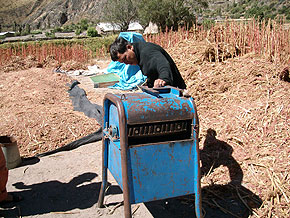 脱穀機と乾燥中のアマランサス